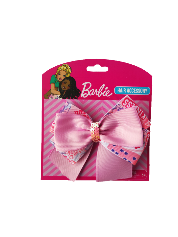 This eye-catching Barbie hair bow features a combination of plain pink ribbon and character-printed ribbon with white elements. This single large bow is suitable for ages 3 and up and can add a playful pop of style to any hairstyle.