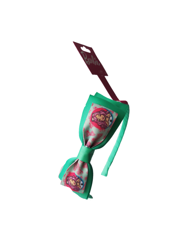 Elevate any look with this Barbie headband, where signature style meets comfort and durability. This item includes a classic bow-tie style clip attached to a coordinating band, crafted with a sturdy base for a secure fit in the hair. The bow is engineered to hold its signature shape through school days, active playdates, and weekend celebrations. The eye-catching top layer features a trendy, colorful graphic print with character art in a vibrant green color scheme that pops against the fabric base.