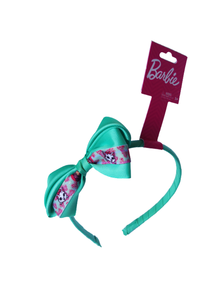 Elevate any look with this Barbie headband, where signature style meets comfort and durability. This item includes a classic accessory attached to a coordinating band, crafted with a sturdy base for a secure fit on the head. The headband is engineered to hold its shape through school days, active playdates, and weekend celebrations. The eye-catching design features a trendy, colorful graphic print with character art in a vibrant green color scheme, accented with pink and purple details, that pops against the fabric base.