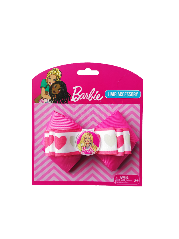 Bring a pop of fun and style to your look with the Barbie Heart Pattern Hair Bow! Featuring a playful fuchsia pink design on durable grosgrain ribbon with charming heart accents and a secure alligator clip, this cute bow is the perfect accessory for any daily adventure.