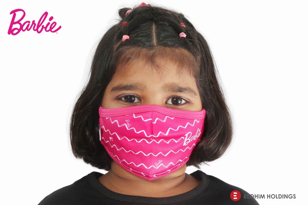 A fun and functional hot pink Barbie logo and zigzag graphic face mask for kids aged 3-6 years, perfect for adding a touch of fashionista style to protective wear.