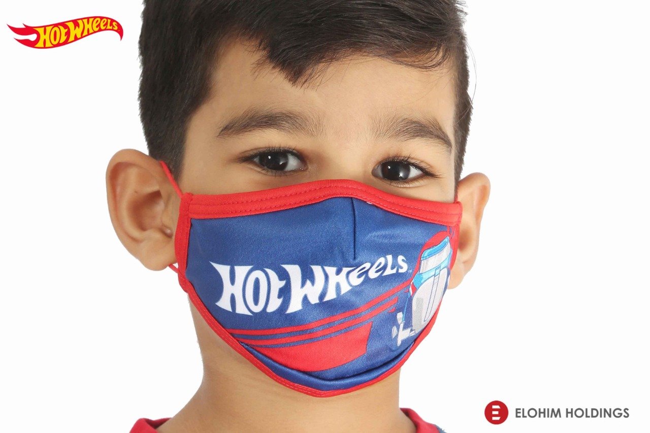 A fun and functional blue and red Hot Wheels graphic face mask for kids, perfect for adding a touch of speedster style to protective wear while ensuring comfort and reusability.