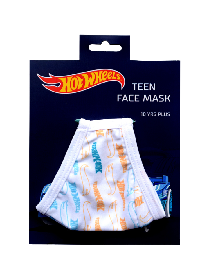 A fun and functional white Hot Wheels logo face mask for teens aged 10+ years, perfect for adding a touch of speedster style to protective wear.