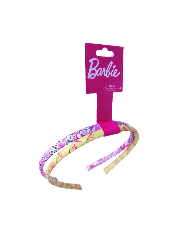 Elevate any look with this Barbie headband set, where signature style meets comfort and durability. This set includes two accessories attached to coordinating bands, crafted with a sturdy base for a secure fit on the head. The headbands are engineered to hold their shape through school days, active playdates, and weekend celebrations. The eye-catching design features a trendy, colorful graphic print with yellow and purple swirls in a vibrant yellow and pink color scheme that pops against the fabric base.
