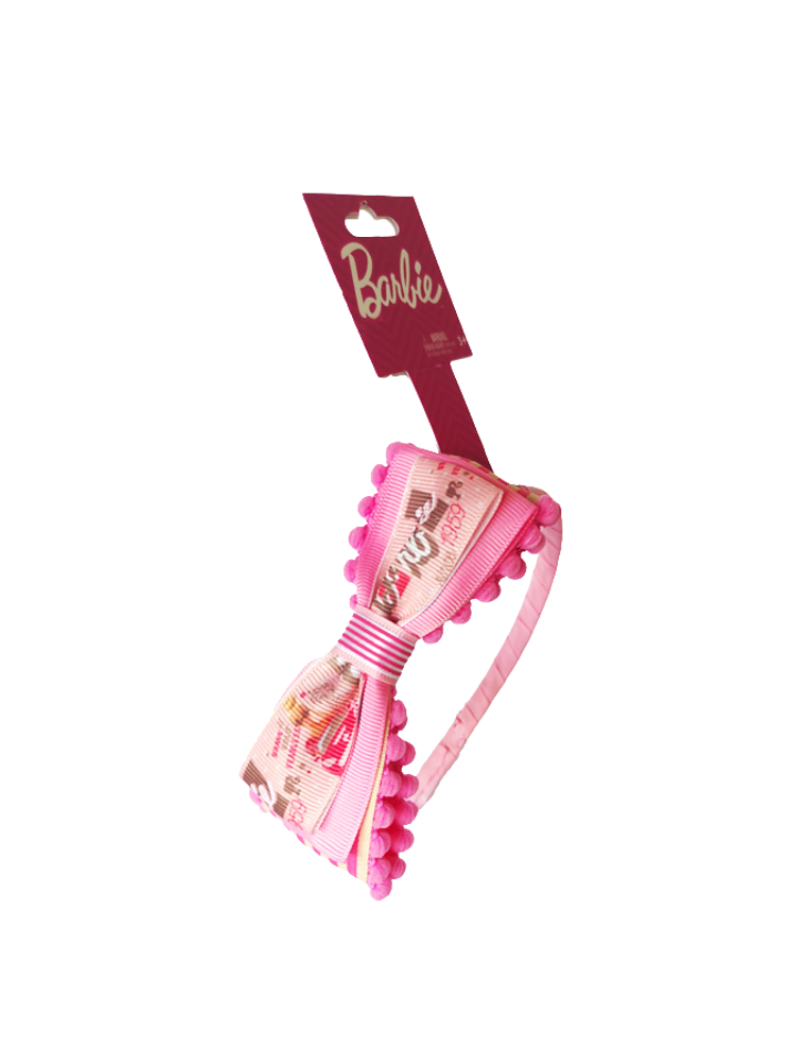 Elevate any look with this Barbie headband, where signature style meets comfort and durability. This item includes a classic accessory with a bow attached to a coordinating band, crafted with a sturdy base for a secure fit on the head. The bow is engineered to hold its signature shape through school days, active playdates, and weekend celebrations. The eye-catching design features a trendy, colorful graphic print with character art in a vibrant pink color scheme, highlighted by ruffled pink trim along the band and a center wrap.