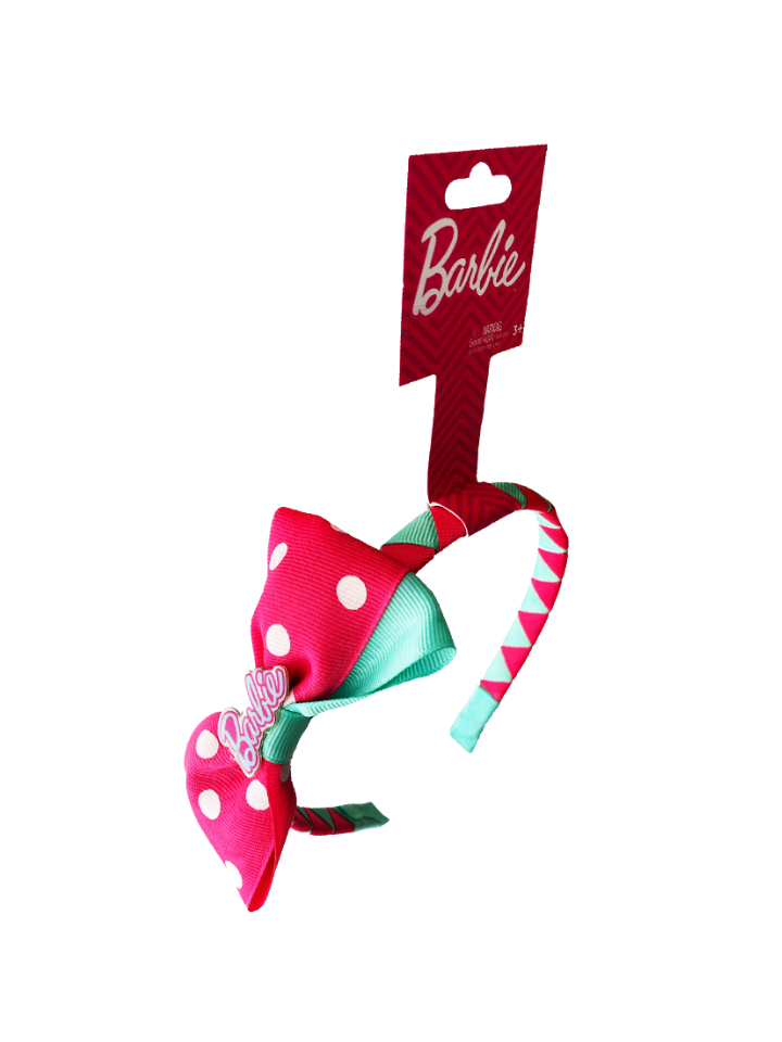 Elevate any look with the Barbie “Polka Dot Pop” Hair Band, where playful style meets comfort and durability. This hair band (also known as an Alice band) is crafted with a flexible, soft-covered base and features a large, charming bow. The bow is engineered to hold its signature shape through school days, active playdates, and weekend celebrations. The eye-catching top layer features a trendy pink and white polka dot design that pops against the solid pink band and the vibrant teal green accents.
