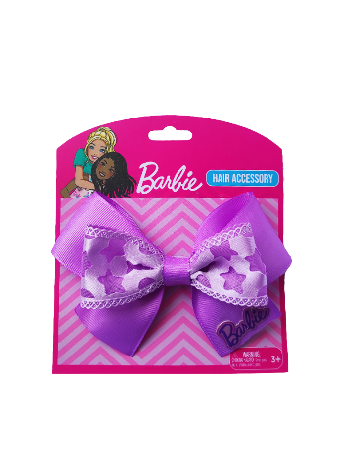 Sparkle and style come together with the Barbie With Stars Purple Hair Bow! Featuring a fun purple and white star pattern on durable grosgrain ribbon and a secure alligator clip, this cute bow is the perfect accessory for any daily adventure
