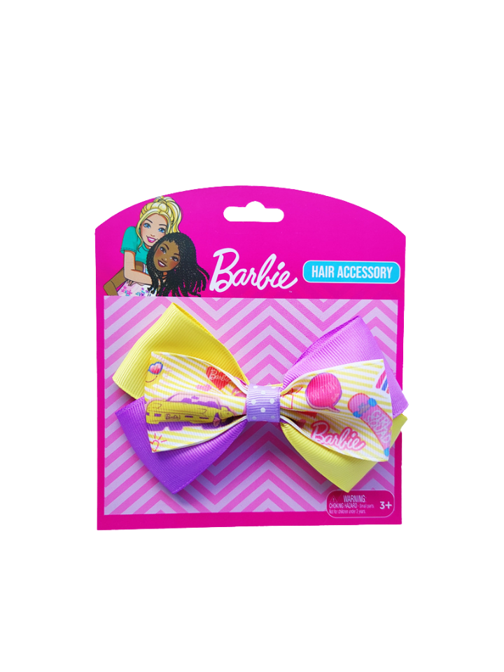 Get ready for the road and accessorize with the Barbie “Road Trip Ready” Hair Bow! Featuring a playful pattern of a pink car, balloons, and stars on durable yellow and purple layered ribbon with a snag-free alligator clip, this bow is the ultimate companion for every daily adventure.