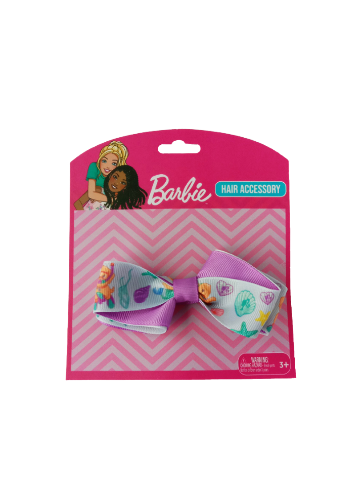 Elevate any look with the Barbie “Seashell Surprise” Hair Bow, where beachy charm meets durability. Crafted from high-quality, double-layered grosgrain ribbon, this bow is engineered to hold its signature shape through school days, active playdates, and weekend beach trips. The eye-catching top layer features a trendy, colorful pattern of Barbie graphics including seashells and leaves that pops against the solid purple bottom layer and pink and white packaging.Dive into style and accessorize with the Barbie “Seashell Surprise” Hair Bow! Featuring a playful pattern of colorful shells and leaves on durable purple and white layered ribbon with a snag-free alligator clip, this bow is the ultimate companion for every daily adventure.