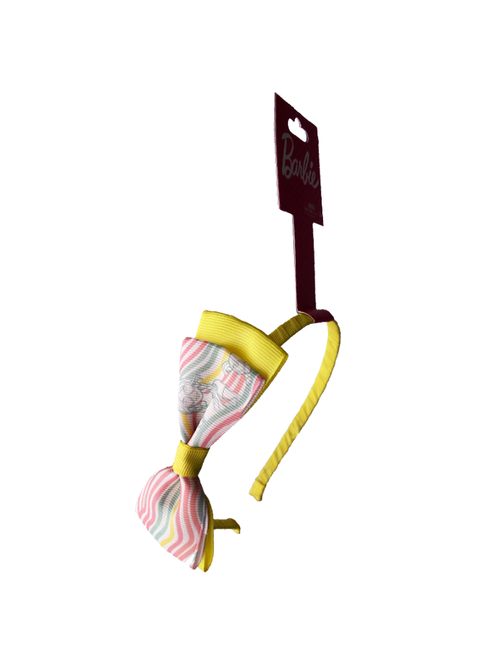 Elevate any look with this Barbie headband, where signature style meets comfort and durability. This hair accessory, a classic bow tie style, is crafted with a sturdy base for a secure fit in the hair. It features a large, charming bow engineered to hold its signature shape through school days, active playdates, and weekend celebrations. The eye-catching top layer features a trendy, colorful striped graphic print with a character accent, which pops against the yellow fabric base.