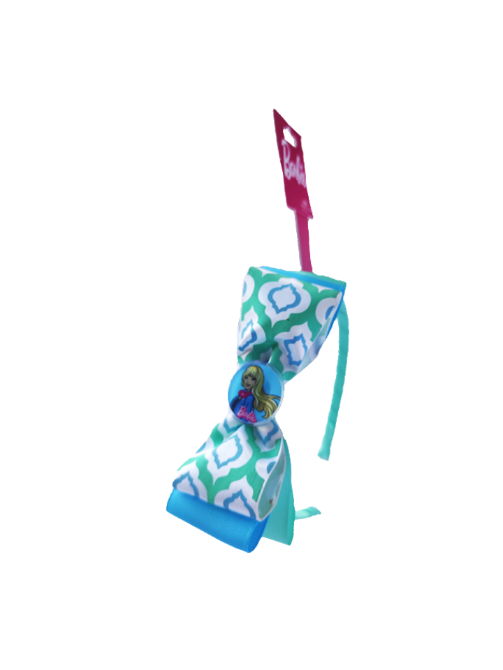 Elevate any look with this Barbie headband, where signature style meets comfort and durability. This item includes a classic accessory attached to a coordinating band, crafted with a sturdy base for a secure fit on the head. The bow design is engineered to hold its shape through school days, active playdates, and weekend celebrations. The eye-catching design features a trendy, colorful graphic print with teal and white in a vibrant teal and white color scheme that pops against the fabric base.